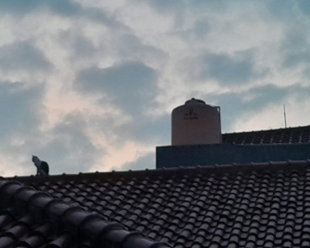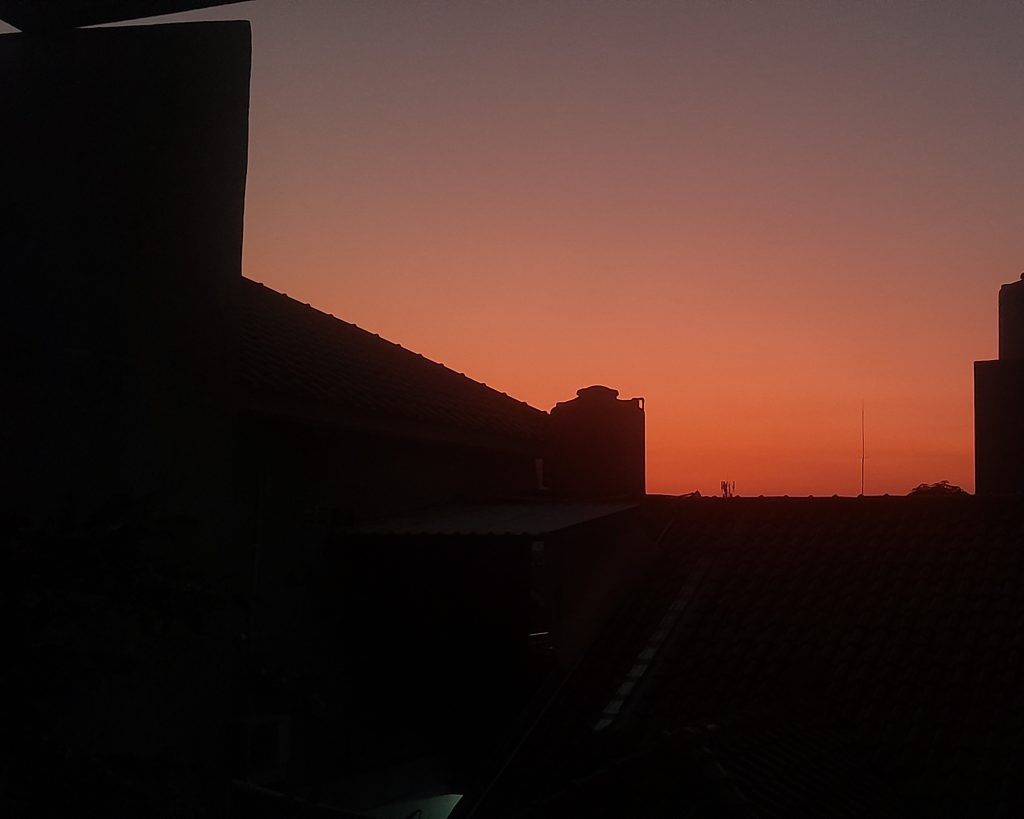 Pemandangan langit dengan corak warna oranye dan biru di tambah dengan bayangan rumah-rumah ini tampak di pagi hari tepat sebelum matahari terbit. Sangat beruntung aku dapat memotret pemandangan ini sehingga aku bisa berbagi dengan kalian semua.