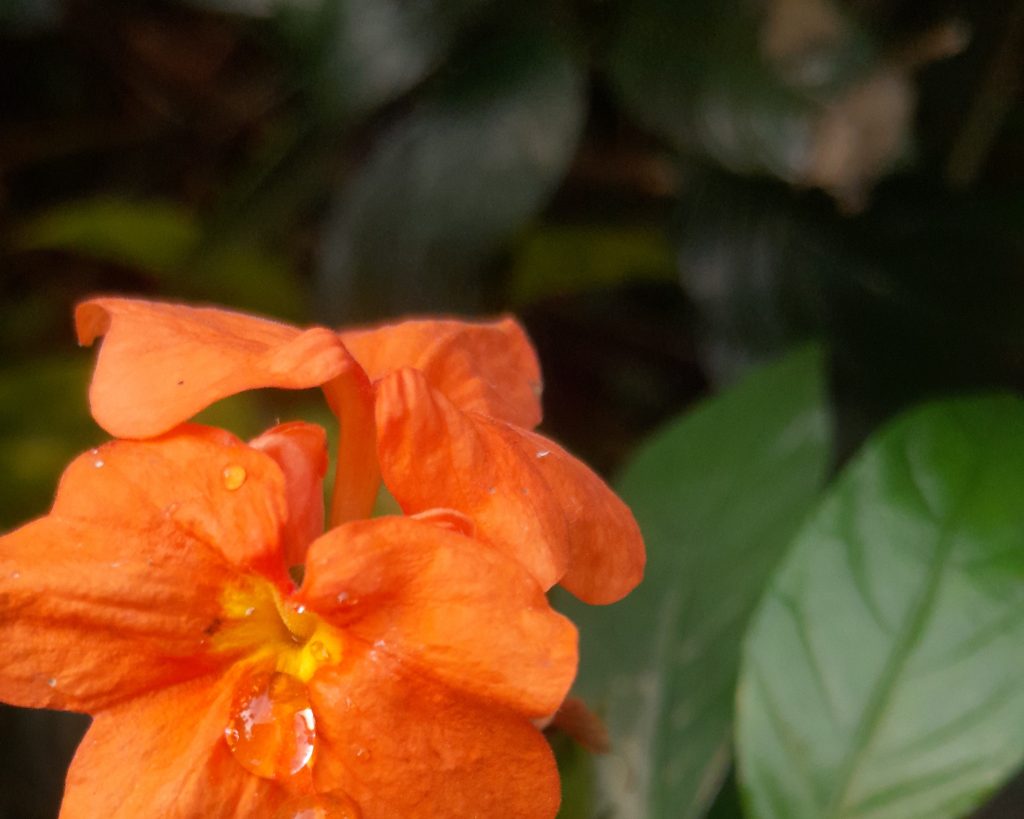 Bunga oranye ini di potret dengan teknik Closeup untuk menangkap butiran air diatas bunga oranye ini. Gambar ini memberikan suasana segar pada bunga seperti habis disiram air.